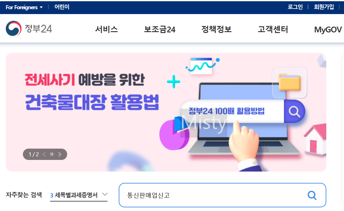 1. 정부24 홈페이지에 접속 후 검색바에서 통신판매업신고를 입력한 후 검색합니다.