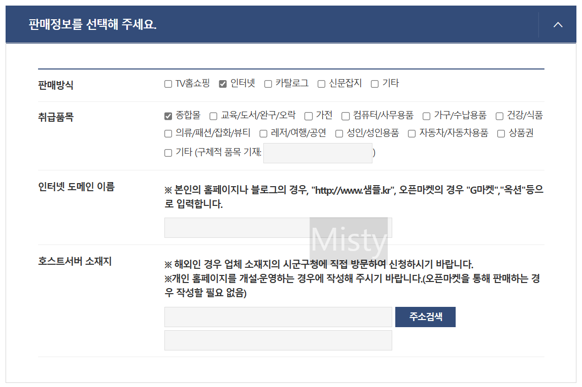 판매방식은 인터넷을 선택하고, 취급품목은 종합몰을 선택, 인터넷도메인 이름과 호스트서버 주소를 입력해 주세요